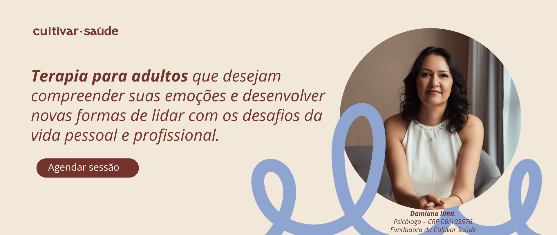 A Cultivar Saúde é um espaço de psicoterapia conduzido por Damiana Lima, psicóloga clínica (CRP 06/103576), com mais de 15 anos de experiência no acompanhamento de adultos.
